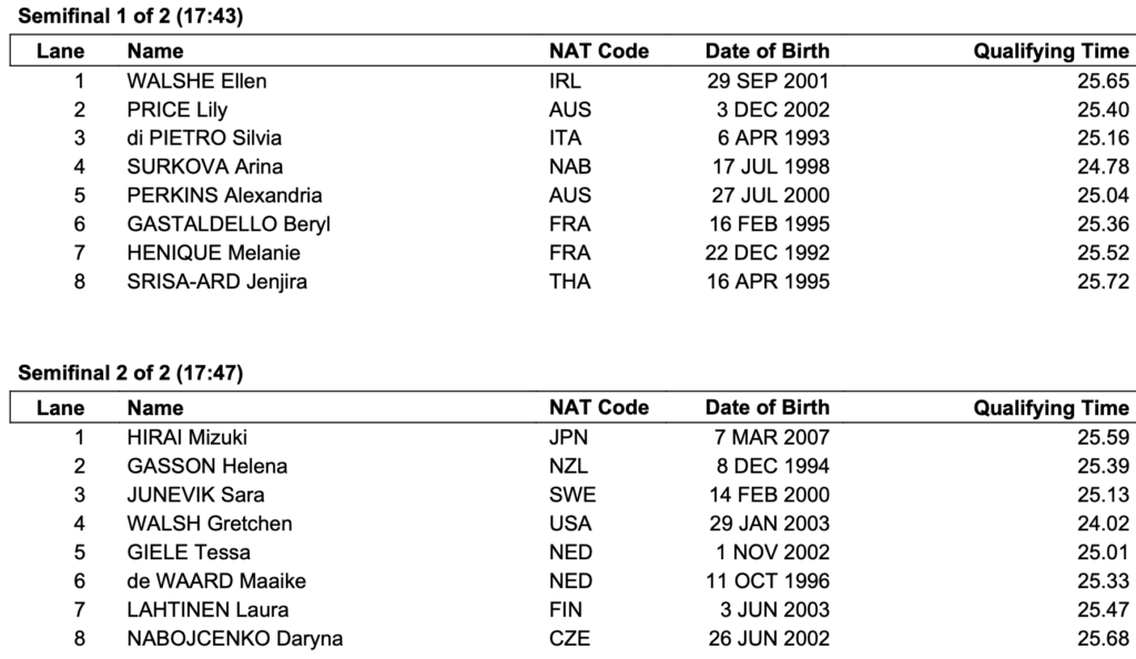 Μια αναμένεται να είναι η απόλυτη πρωταγωνίστρια στα 50μ πεταλούδα των γυναικών. Μετά το απίστευτο παγκόσμιο ρεκόρ στα πρωινά προκριματικά, η Γκρέτσεν Γουόλς θα μπει στην πισίνα προκειμένου να εξασφαλίσει την συμμετοχή της στον τελικό. Με τις Τόρι Χάσκ (ΗΠΑ) και τη Μάγκι Μακνίλ (Καναδάς), τις νικήτριες του 2022, να είναι απούσες υπάρχει χώρος για αρκετές αθλήτριες να κερδίσουν μια θέση στον τελικό. Στην Μελβούρνη, η τελευταία που είχε πάρει την πρόκριση για τον τελικό είχε κολυμπήσει σε 25.13.
