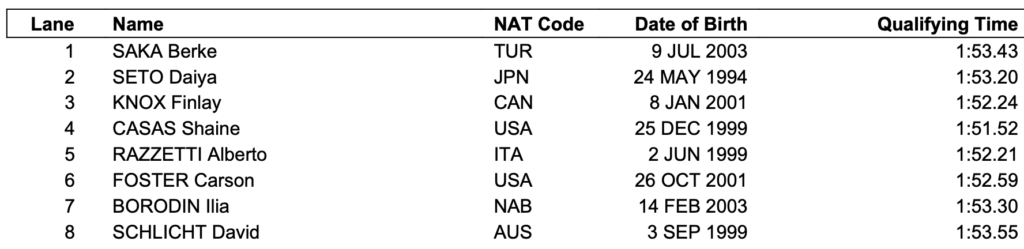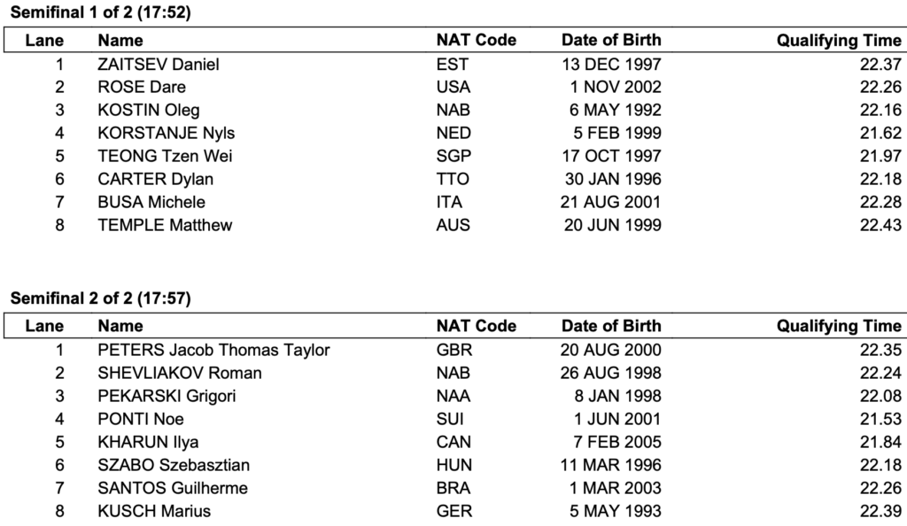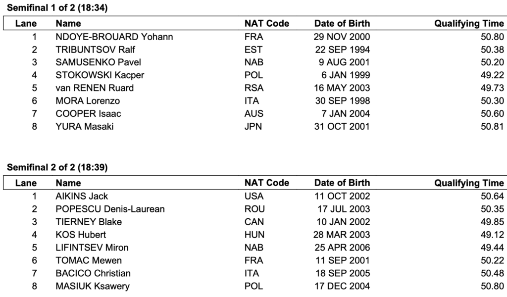 Η προσοχή στρέφεται στον «γηπεδούχο» Ούγγρο Ούμπερτ Κος που ήταν ο πιο γρήγορος στα προκριματικά και θα αγωνιστεί στη δεύτερη σειρά, ενώ περιμένουμε να ανεβάσουν ταχύτητα ο «αργυρός» και ο «χάλκινος» της Μελβούρνης, ο Ιταλός Λορένζο Μόρα και ο Αυστραλός Άιζακ Κούπερ που θα αγωνιστούν δίπλα-δίπλα στην πρώτη σειρά. Δεν ξεχνάμε τον Πολωνό Κάσπερ Στοκόφσι και τον ουδέτερο (Ρώσο) Μίρον Λιφίντσεφ. Στο 50.01 έκλεισε η οκτάδα του τελικού το 2022 στη Μελβούρνη.
