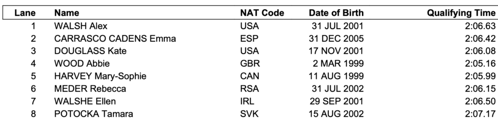 Η υπερασπίστρια του τίτλου Κέιτ Ντάγκλας από τη διαδρομή 3 θα αντιμετωπίσει την Αγγλίδα Άμπι Γούντ και την Καναδέζα Μέρι Σόφι Χάρβει, που θα βρίσκονται στους δίπλα διαδρόμους, για να την εκθρονίσουν. Στα προκριματικά, γρηγορότερα από όλες κολύμπησε η Γουντ, ενώ η καλύτερη επίδοση φέτος ανήκει στην Ντάγκλας με 2:04.09 από το Παγκόσμιο Κύπελλο. Πριν δύο χρόνια, η Ντάγκλας είχε τερματίσει σε 2:02.12 στον τελικό, ενώ τα μετάλλια είχαν κλείσει στο 2:03.57.