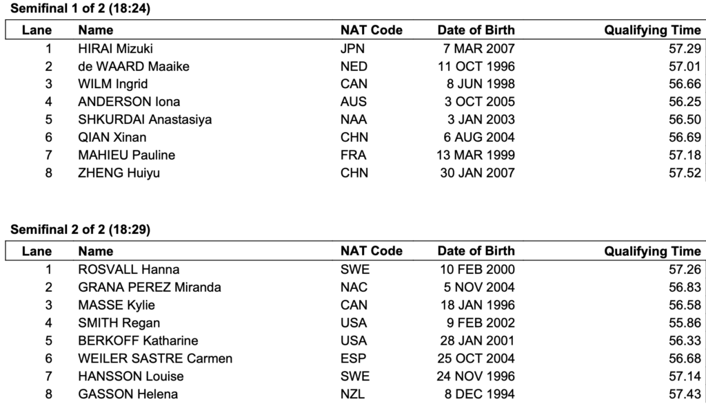 Η Αμερικανίδα Ρίγκαν Σμίθ επιβεβαίωσε την κυριαρχία της στα πρωινά προκριματικά, σημειώνοντας την καλύτερη επίδοση, και το απόγευμα θα κάνει ακόμη ένα βήμα στον δρόμο για τον τελικό. Μαζί της θα είναι η Κάιλι Μας (Καναδάς), η Αιόνα Άντερσον, αλλά και η Ίνγκριτ Βίλμ (Καναδάς). Ο χρόνος πρόκρισης στον τελικό αναμένεται να είναι κάπου κοντά στο 56.50 με τα δεδομένα του προκριματικού, δηλαδή παρόμοιος με αυτόν του 2022 (56.54)