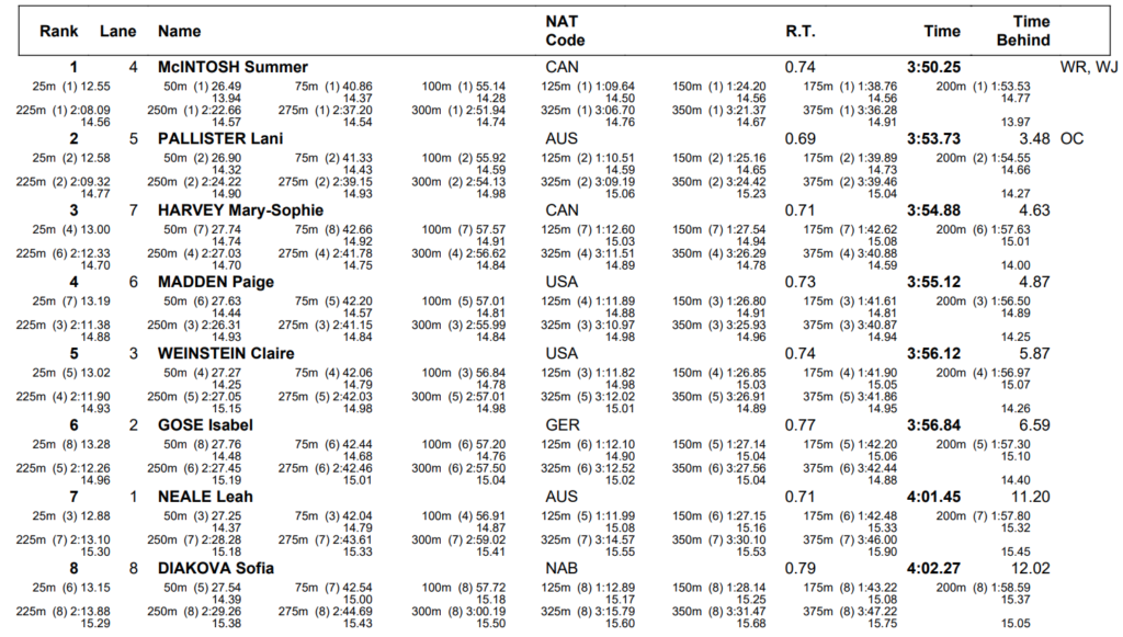 Η 18χρονη Καναδέζα ακούμπησε τον τοίχο σχεδόν ένα δευτερόλεπτο γρηγορότερα από κάθε άλλη κολυμβήτρια στην ιστορία και με 3:50.25 οικειοποιήθηκε ξανά το ρεκόρ που της είχε πάρει το 2022 η Κινέζα Μπίνγκτζιε Λι με 3:51.30. Παράλληλα, η παραπάνω επίδοση αποτελεί και νέο ρεκόρ νεανίδων στο αγώνισμα.