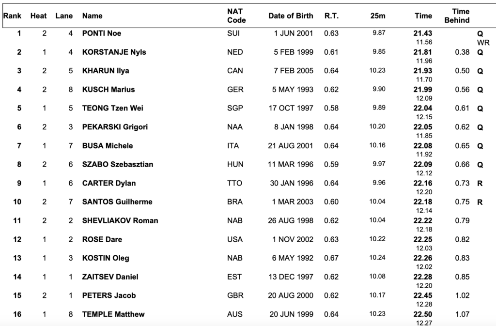 Ο Ελβετός Πόντι κατάφερε να καταρρίψει το 21.50 που είχε πετύχει στο Παγκόσμιο Κύπελλο της Σιγκαπούρης πριν από περίπου έναν μήνα, κολυμπώντας 7 εκατοστά του δευτερολέπτου γρηγορότερα στον ημιτελικό των 50μ πεταλούδα στο Παγκόσμιο Πρωτάθλημα 25άρας στη Βουδαπέστη.