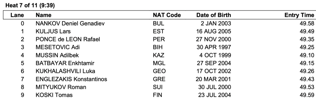 Λίγα λεπτά αργότερα, ο Κωνσταντίνος Εγγλεζάκης θα κάνει το ντεμπούτο του στη διοργάνωση και θα κολυμπήσει στην 7η διαδρομή της 7ης/11 προκριματικές σειρές. Ο 23χρονος αθλητής έχει τον 6ο καλύτερο χρόνο* μεταξύ των συμμετεχόντων στη σειρά του και θα κληθεί να εξασφαλίσει την παρουσία του στη συνέχεια.
