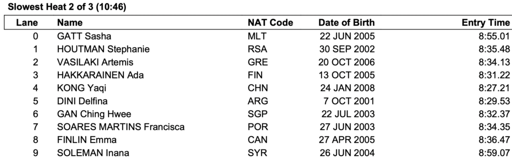 Η Άρτεμις Βασιλάκη, το νεότερο μέλος της ελληνικής αποστολής θα συμμετάσχει για πρώτη φορά σε αγώνα 800μ σε 25άρα πισίνα, και θα αγωνιστεί στην 2η από τις τρεις αργές σειρές του πρωινού προγράμματος. Η Βασιλάκη θα βρεθεί στη διαδρομή με τον αριθμό 2, αφού η ίδια κατέχει τον 5ο καλύτερο χρόνο στη σειρά της*.
