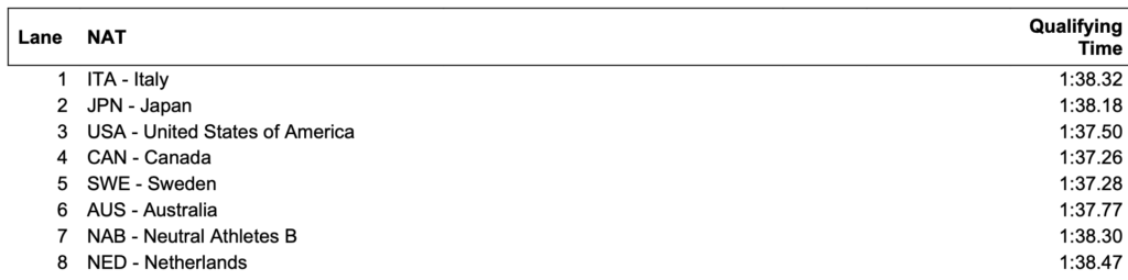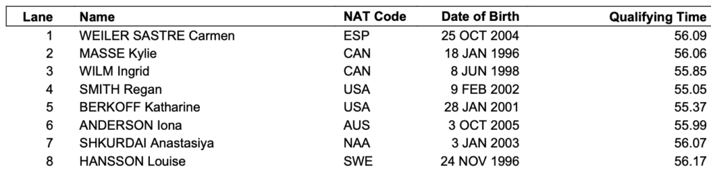 Η κάτοχος του παγκοσμίου ρεκόρ, Ρίγκαν Σμιθ, αφού πέρασε σχετικά εύκολα το εμπόδιο του προκριματικού και του ημιτελικού, ετοιμάζεται να τα δώσει όλα στον τελικό των 100μ ύπτιο στην πρώτη της συμμετοχή στη διοργάνωση, εκμεταλλευόμενη την απουσία της Αυστραλέζας Κέιλι Μακιούαν. Αν και υπάρχουν αθλήτριες με αρκετές καλές επιδόσεις (στο ΤΟΡ 10 φέτος), όπως η Κάθριν Μπέρκοφ, η Αιόνα Άντερσον και η «χάλκινη» το 2022 Ίνγκριτ Βίλμ, η Αμερικανίδα δεν αναμένεται να δυσκολευτεί.