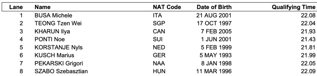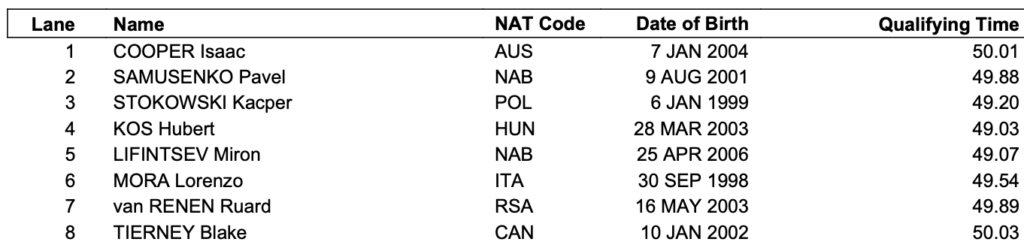 Ο οικοδεσπότης Ούμπερτ Κος είναι ένα από τα μεγαλύτερα φαβορί για τον τίτλο στα 100μ ύπτιο, αλλά αυτό δεν σημαίνει ότι είναι ο μοναδικός. Ο Ούγγρος κολυμβητής θα πρέπει πρώτα να περάσει το εμπόδιο του «χάλκινου» και του «ασημένιου» μεταλλιούχου το 2022, Λορέντσο Μόρα και Άιζακ Κούπερ που θα πάρουν μέρος στην κούρσα με στόχο το πολυπόθητο χρυσό μετάλλιο, ενώ εκεί θα βρίσκεται ο 18χρονος Μίρον Λιφίντσεφ που αγωνίζεται ως ανεξάρτητος και μπορεί να απειλήσει τον Κος με βάση τους χρόνους που έχει σημειώσει.