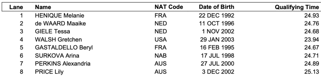 Θα είναι τεράστια έκπληξη αν η Αμερικανίδα Γκρέτσεν Γουόλς δεν κερδίσει τον τίτλο στα 50μ πεταλούδα. Μετά από δύο συνεχόμενα παγκόσμια ρεκόρ στον προκριματικό και τον ημιτελικό και όντας πλέον η μόνη γυναίκα που έχει καταφέρει να κολυμπήσει σε χρόνο κάτω από τα 24 δευτερόλεπτα, η Γουόλς θα μπει θριαμβευτικά στον απογευματινό τελικό. Η μεγάλη μάχη θα γίνει για την ανάδειξη των υπόλοιπων μεταλλιούχων, αφού αθλήτριες με πολύ κοντινές επιδόσεις θα πρέπει να παλέψουν για τα δύο εναπομείναντα μετάλλια. Μεταξύ αυτών, η Γαλλίδα Μπέριλ Γκασταλντέλο, η ανεξάρτητη Αλεξάνδρα Σούρκοβα και η Αυστραλή Αλεξάνδρια Πέρκινς