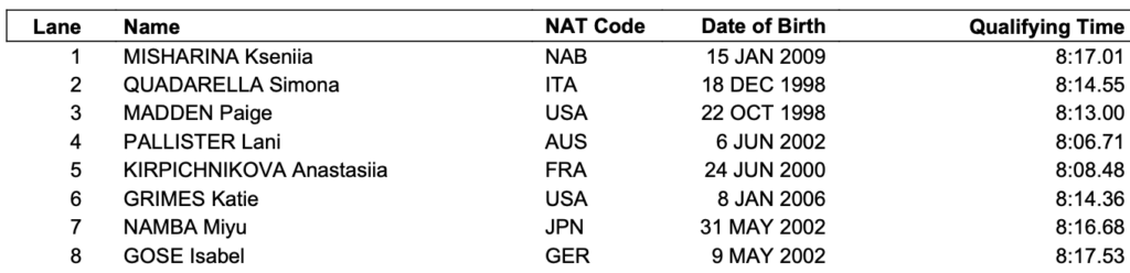 Η Αυστραλέζα Λάνι Πάλιστερ θα επιδιώξει να υπερασπιστεί τον τίτλο της στα 800μ ελεύθερο, ενώ από τις περσινές μεταλλιούχους η μόνη παρόυσα θα είναι η Γιαπωνέζα Νάμπα. Αυτή που είναι πιο πιθανό να απειλήσει την Πάλιστερ είναι η Γαλλίδα -πρώην Ρωσίδα- ασημένια Ολυμπιονίκης του Παρισιού Κιρπιτσνίκοβα.