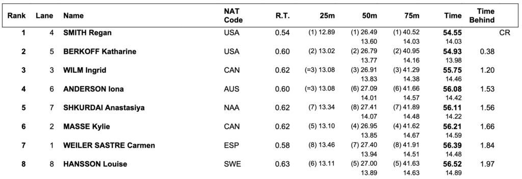 H Ρίγκαν Σμιθ αποφάσισε να το πάει «χαλαρά» σήμερα και έτσι αρκέστηκε στο ρεκόρ διοργάνωσης της Κατίνκα Χόσου. Η αθλήτρια που έσπασε δύο φορές το παγκόσμιο ρεκόρ στο Παγκόσμιο Κύπελλο του Οκτωβρίου τερμάτισε σε 54.55 έναντι του 55.03 της Χόσου και κατέκτησε επάξια το χρυσό μετάλλιο με αρκετή διαφορά από τις υπόλοιπες. Η Αμερική έκανε το 1-2, αφού το ασημένιο πήγε στην επίσης Αμερικανίδα Κάθριν Μπέρκοφ με 54.93, ενώ το βάθρο συμπλήρωσε η Καναδέζα Ίνγκριτ Βίλμ με 55.75.