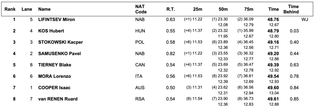 Οι κραυγές μετατράπηκαν σε σιωπή σε κλάσματα του δευτερολεπτου στον τελικό των 100μ ύπτιο των ανδρών. Εκεί που στο τελευταίο 25άρι, ο Ούγγρος Ούμπερτ Κος προηγούνταν στην κούρσα και οι ντόπιοι ήταν έτοιμοι να πανηγυρίσουν τη νίκη, ο ανεξάρτητος (Ρώσος) Μίρον Λιφίντσεφ τους άλλαξε το πρόγραμμα. Με ένα εκπληκτικό τελευταίο 50άρι, ο 18χρονος Ρώσος όχι μόνο «έκλεψε» τη νίκη, αλλά παράλληλα σημείωσε και νέο παγκόσμιο ρεκόρ στο αγώνισμα στην κατηγορία των εφήβων με 48.76. Ο Κος ακολούθησε με 48.79, ενώ την κορυφαία τριάδα συμπλήρωσε ο Πολωνός Κάσπερ Στοκόβσκι, με χρόνο 49.16.