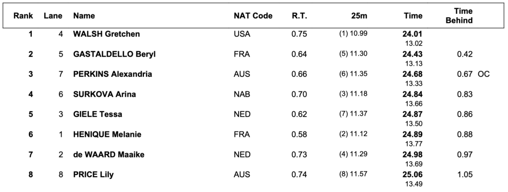 Με 24.01 η Αμερικανίδα Γκρέτσεν Γουόλς αναδείχθηκε, όπως αναμενόταν, παγκόσμια πρωταθλήτρια στα 50μ πεταλούδα. Η επίδοση αυτή αποτελεί την δεύτερη καλύτερη όλων των εποχών στο αγώνισμα, μετά το δικό της παγκόσμιο ρεκόρ από τα χθεσινά ημιτελικά (23.94). Στη δεύτερη θέση ακολούθησε η Γαλλίδα -πρώην Ρωσίδα- Μπέριλ Γκασταλντέλο με 24.43, ενώ το χάλκινο μετάλλιο πήγε στην Αυστραλέζα Αλεξάντρια Πέρκινς με χρόνο 24.68.