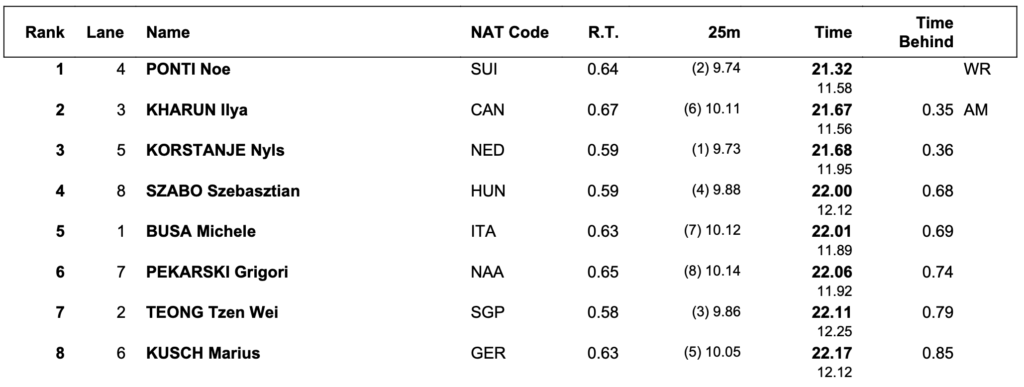 Ο Νόε Πόντι επιβεβαίωσε για ακόμη μια φορά ότι πρόκειται για τον απόλυτο κυρίαρχο στα 50μ πεταλούδα με το νέο παγκόσμιο ρεκόρ που πέτυχε. Ο Ελβετός είχε φύγει από τη σειρά αγώνων του Παγκοσμίου Κυπέλλου με δύο παγκόσμια ρεκόρ και χρόνο 21.50, και έκανε άλλα δύο ρεκόρ στη Βουδαπέστη και χρόνο 21.32. Το βάθρο συμπλήρωσαν οι Ίλια Καρούν (Καναδάς) με 21.67 και Νιλς Κορστάνιε (Ολλανδία) με 21.68, αμφότεροι πιο γρήγοροι από το παγκόσμιο ρεκόρ που ίσχε μέχρι τον Οκτώβριο, το 21.75!