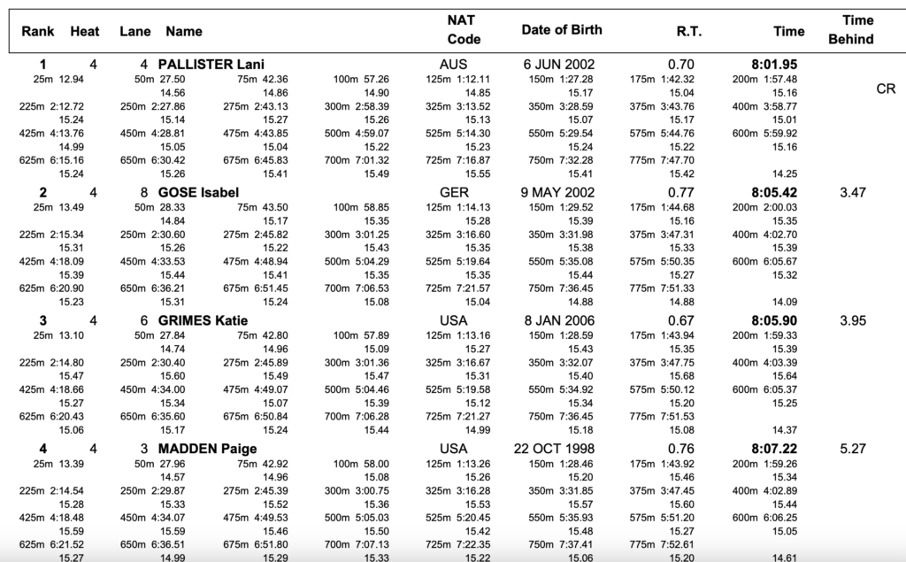 Η Λάνι Πάλιστερ χάρισε στην Αυστραλία το μοναδικό της χρυσό μετάλλιο για τη δεύτερη μέρα του πρωταθλήματος, υπερασπιζόμενη τον τίτλο της από τη Μελβούρνη. Η Αυστραλέζα όχι μόνο κολύμπησε γρηγορότερα από όλες στην ταχύτερη σειρά των 800μ ελεύθερο, αλλά έβαλε την υπογραφή της και στο ρεκόρ αγώνων με 8:01.95. Το συγκεκριμένο ρεκόρ άνηκε στην Κινέζα Μπίντζιε Λι με 8:02.90 από τη διοργάνωση του Αμπού Ντάμπι. Στο δεύτερο και στο τρίτο σκαλί του βάθρου ανέβηκαν αντίστοιχα η Γερμανίδα Ίζαμπελ Γκόζε με 8:05.42 και η Αμερικανίδα Κέιτι Γκράιμς με 8:05.90.