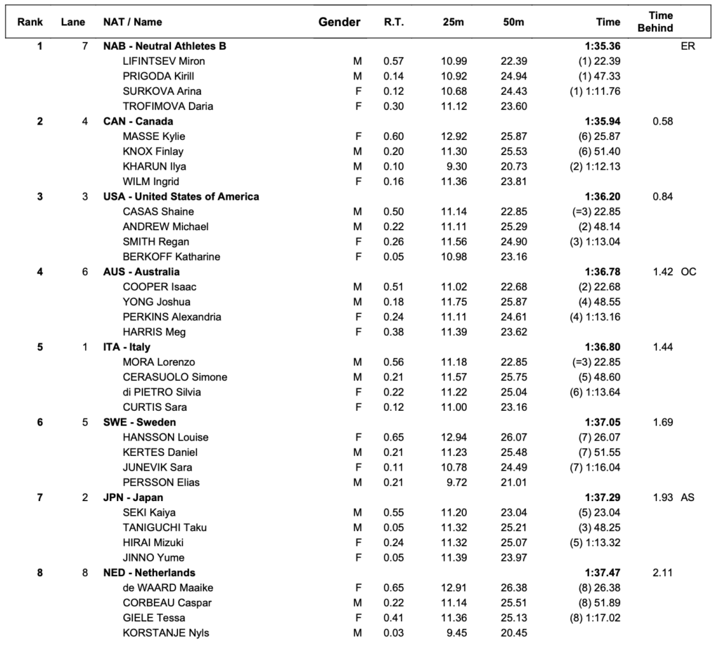 Ο ύμνος της World Aquatics ακούστηκε για ακόμη μια φορά στα ηχεία της Ντόυνα Αρένα, μετά την νίκη των ανεξάρτητων (Ρώσων) στην μεικτή σκυταλοδρομία 4Χ50μ μεικτή. Η ρωσική ομάδα ακούμπησε πρώτη τον τοίχο κολυμπώντας σε 1:35.36. Με αυτό τον χρόνο κατέρριψε το Ευρωπαϊκό ρεκόρ (Ιταλία – 1:36.01), ενώ έφτασε πολύ κοντά και στο παγκόσμιο ρεκόρ των ΗΠΑ (1:35.15 από το 2022). Το βάθρο συμπλήρωσαν ο Καναδάς με 1:35.94 και οι ΗΠΑ με 1:36.20.Οι Μίρον Λιφίντσεφ (ύπτιο), Κίριλ Πριγκόντα (πρόσθιο), Αρίνα Σούρκοβα (πεταλούδα) και Ντάρια Τροφίμοβα (ελεύθερο) έγιναν οι πρώτοι/ες κολυμβητές/ριες που ανεβαίνουν σε ομαδικό βάθρο διεθνούς διοργάνωσης κολύμβησης τα τελευταία τρία χρόνια, από το 2021 και το Ευρωπαϊκό 25αρας του Καζάν (Ρωσία)