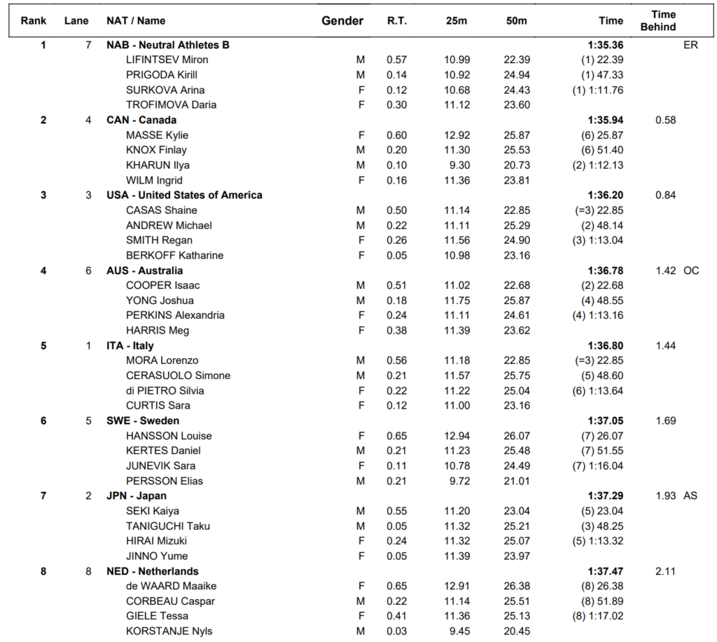 Στον τελικό των mixed 50μ μεικτή ρωσική ομάδα ακούμπησε πρώτη τον τοίχο κολυμπώντας σε 1:35.36. Με αυτό τον χρόνο κατέρριψε το Ευρωπαϊκό ρεκόρ (Ιταλία – 1:36.01), ενώ έφτασε πολύ κοντά και στο παγκόσμιο ρεκόρ των ΗΠΑ (1:35.15 από το 2022). Το βάθρο συμπλήρωσαν ο Καναδάς με 1:35.94 και οι ΗΠΑ με 1:36.20. Θυμίζουμε ότι η World Aquatics επέτρεψε την παρουσία ομάδων από τους ουδέτερους αθλητές με αλλαγή κανονισμού τον Νοέμβριο.