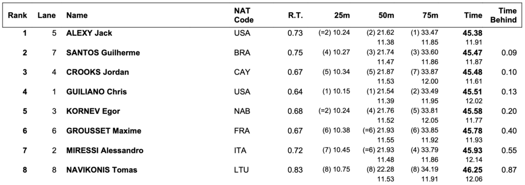 Ο Τζακ Αλέξι παρέκαμψε το εμπόδιο του Τζόρνταν Κρουκς, του νέου κάτοχου του ρεκόρ αγώνων, και αναδείχθηκε παγκόσμιος πρωταθλητής στα 100μ ελεύθερο των ανδρών με 45.38. Δεύτερος ήταν ο Βραζιλιάνος Γκουιλέρμε Σάντος με 45.47, ενώ ο πρωταγωνιστής σε προκριματικά και ημιτελικά, Κρουκς έμεινε τρίτος με 45.48.