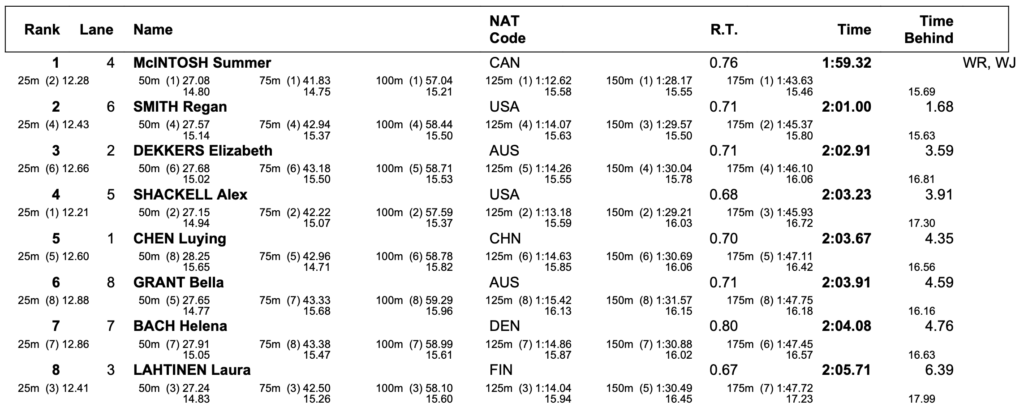 Με τρομερή κούρσα από την αρχή μέχρι το τέλος στα 200μ πεταλούδα η 18χρονη Καναδέζα τερμάτισε σε 1:59.32 και έκανε δικό της το παγκόσμιο ρεκόρ γυναικών που διατηρούσε η Ισπανίδα Μιρέια Μπελμόντε Γκαρθία εδώ και 10 χρόνια, από το Παγκόσμιο της Ντόχα, με 1:59.61. Παράλληλα βελτίωσε το δικό της παγκόσμιο ρεκόρ νεανίδων του 2:01.96 που είχε σημειώσει το πρωί. Ακολούθησε η Ρίγκαν Σμιθ (ΗΠΑ) με 2:01.00 και τρίτη ήταν η Αυστραλέζα Ελίζαμπεθ Ντέκερς με 2:02.91.
