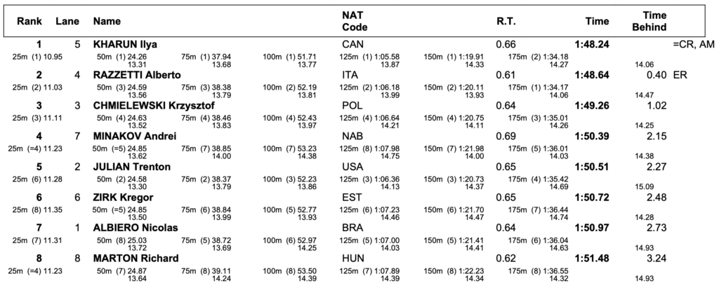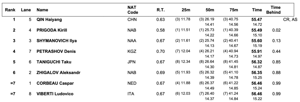Ο Χάιγιανγκ Τσιν έβαλε την υπογραφή του στο ρεκόρ αγώνων του Ιλία Σιμάνοβιτς (55.70), με 55.47. Ο Κινέζος επιβεβαίωσε τα προγνωστικά που τον ήθελαν να είναι το φαβορί και έτσι άφησε πίσω του τόσο τον Σιμάνοβιτς που ήρθε τρίτος με 55.60, όσο και τον Ρώσο Κιρίλ Πριγκόντα που τον πλησιάσε αρκετά με 55.49. Γενικότερα, το επίπεδο της κούρσας ήταν αρκετά ανεβασμένο, αφού και οι τρεις αθλητές κολύμπησαν κάτω από το προηγούμενο ρεκόρ αγώνων του 2021.