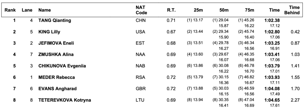 Το παγκόσμιο ρεκόρ ξέφυγε από την Κιάτινγκ Τανγκ για ακόμη μια φορά σε αυτό το παγκόσμιο πρωτάθλημα. Η Κινέζα μετά το 1:02.37 που πέτυχε στον ημιτελικό, τερμάτισε σε 1:02.38 στον τελικό και πήρε την πρώτη θέση, με διαφορά μόλις 2 εκατοστών από το παγκόσμιο ρεκόρ. Η υπερασπίστρια του τίτλου Λίλι Κινγκ πήρε τελικά τη δεύτερη θέση, σταματώντας το χρονόμετρο στο 1:02.80, ενώ το χάλκινο πήγε στην Εστονή Ενέλι Γεφίμοβα με 1:03.25.