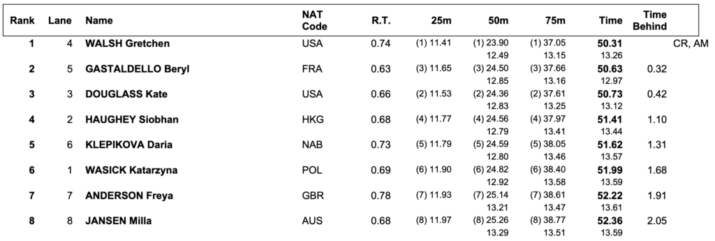 Η Γκρέτσεν Γουόλς συνέχισε το σερί των ρεκόρ της και στον τελικό των 100μ ελεύθερο. Μπορεί να μην πήρε το παγκόσμιο ρεκόρ από την Αυστραλέζα Κέιτ Κάμπελ, αλλά βρέθηκε μόλις 6 εκατοστά μακριά του, σημειώνοντας νέο ρεκόρ αγώνων και ρεκόρ Αμερικής με 50.31. Πίσω της ακολούθησαν η Μπέριλ Γκασταλντέλλο με 50.63 και η Κέιτ Ντάγκλας με 50.73. Όλες τους σημείωσαν επιδόσεις κάτω από το ρεκόρ αγώνων της Έμμα Μακίον που βρισκόταν σε ισχύ μέχρι πριν λίγες μέρες.