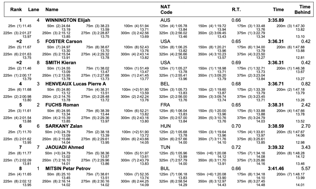 Ο Ελάιτζα Γουίνινγκτον από την Αυστραλία, ήταν ο μεγάλος πρωταγωνιστής στον τελικό των 400μ ελεύθερο με 3:35.89. Ο Γουίνιγκτον έμεινε μακριά από το ρεκόρ αγώνων του Ντάνας Ράπσις (Λιθουανία), που μένει ακλόνητο από το 2018 με 3:34.01 Στο συγκεκριμένο αγώνισμα δεν υπήρχε χάλκινο μετάλλιο στην απονομή, αφού ακολούθησαν ταυτόχρονα σε 3:36.31 οι Αμερικανοί Κάρσον Φόστερ και Κίραν Σμιθ.