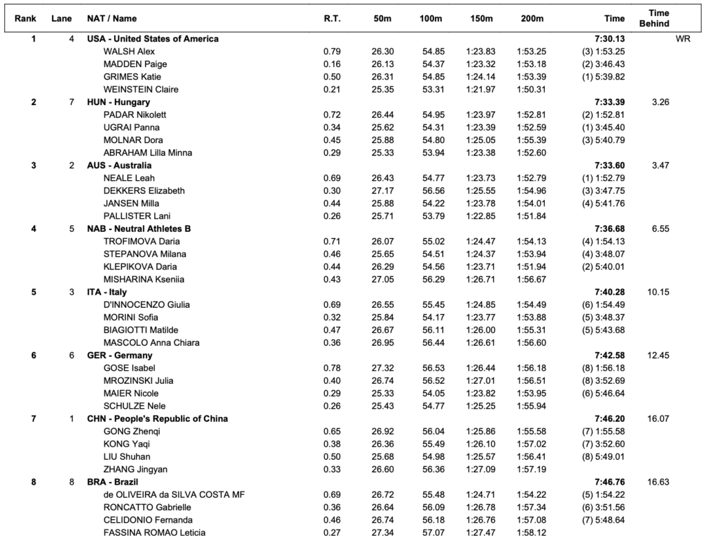Η ομάδα των ΗΠΑ αποτελούμενη από τις Άλεξ Γουόλς, Πέιτζ Μέιντεν, Κέιτι Γκράιμς, και Κλέρ Γουάινσταιν «έκλεψε» το παγκόσμιο ρεκόρ από την οικοδέσποινα του πρωταθλήματος του 2022, την Αυστραλία, που σε αυτή τη διοργάνωση έφυγε με το χάλκινο, ολοκληρώνοντας την κούρσα σε 7:33.60. Οι Αμερικανίδες ολοκλήρωσαν τον αγώνα τους σε 7:30.13, σβήνοντας έτσι το 7:30.87 μια για πάντα από τη λίστα με τα παγκόσμια ρεκόρ. Παρόλα αυτά, όλο το στάδιο σείστηκε για τις γηπεδούχες, την 20χρονη Ουγκράι και τις 18χρονες ΠανταρΜόλναρ και Άμπραχαμ, οι οποίες έκλεψαν την παράσταση με το ασημένιο μετάλλιο και το το 7:33.39, ενώ για κάποια μέτρα βρέθηκαν και σε τροχιά παγκοσμίου ρεκόρ.