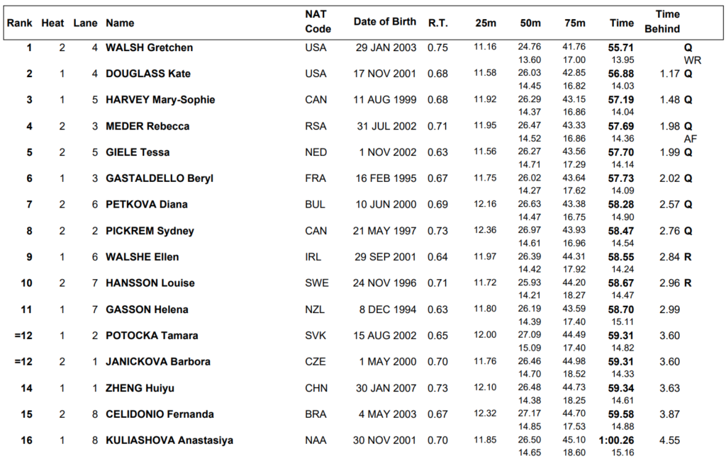 Η “βιονική” Αμερικανίδα με περισσότερο από ένα σώμα διαφορά από τις υπόλοιπες τερμάτισε στην 2η ημιτελική σειρά σε χρόνο 55.71 και βελτίωσε το δικό της 55.98 που είχε σημειώσει σε μίτινγκ του NCAA. Μέσα στο 2024 η 21χρονη Γουολς έχει καταρρίψει τέσσερα παγκόσμια ρεκόρ σε ατομικά αγωνίσματα ( στα 50μ πεταλούδα και 2 στα 100μ μεικτή) και ένα σε ομαδικό (4Χ100μ ελεύθερο με την ομάδα της ΗΠΑ). Νωρίτερα πήρε τον παγκόσμιο τίτλο και στα 100μ ελεύθερο με διαφορά μόλις 0.06 από το παγκόσμιο ρεκόρ της Κάμπελ. Αύριο στον τελικό των 100μ μεικτή θα έχει την ευκαιρία να κυνηγήσει και το ρεκόρ Νο6.