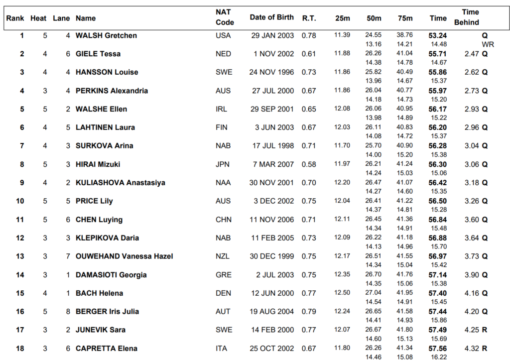 Μπορεί ο χρόνος που έκλεισε η 16άδα να ήταν πιο γρήγορος από το 2022, 57.44 έναντι 57.85, αλλά αυτό δεν αποτέλεσε εμπόδια για την αθλήτρια του Ωκεανού που πλέον στοχεύει ακόμα πιο κάτω, σε χρόνο με 56 μπροστά. Αυτή είναι η πρώτη εξασφαλισμένη ελληνική παρουσία σε απογευματινό πρόγραμμα στη διοργάνωση.