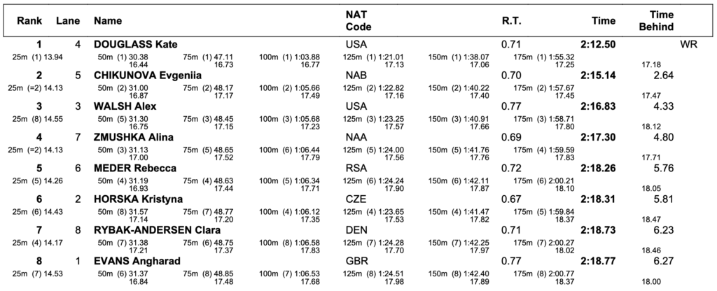 Η Κέιτ Ντάγκλας βελτίωσε το δικό της παγκόσμιο ρεκόρ στα 200μ πρόσθιο, κολυμπώντας 22 δευτερόλεπτα γρηγορότερα και επιβεβαίωσε την κυριαρχία της.