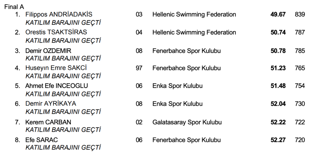 Εξαιρετική κούρσα έκανε και ο συναθλητής του στο Εθνικό κλιμάκιο, Φίλιππος Ανδριαδάκης (ΟΣΦΠ) στα 100μ ελεύθερο, ο οποίος πήρε τη νίκη με 49.67 και βελτίωσε κατά πολύ το 49.97 που είχε σημειώσει πέρυσι στο Πανελλήνιο νέων στα Γιάννεννα. Με το 49.67 σίγουρα βάζει υποψηφιότητα για την 4Χ100μ των ανδρών, ενώ πλησίασε περισσότερο και το όριο για το Ευρωπαϊκό Κ23 που είναι 49.31. Στο βάθρο ανέβηκε και ο Ορέστης Τσακτσίρας (ΠΑΟΚ) που ακολούθησε τον τελικό Α με 50.74.