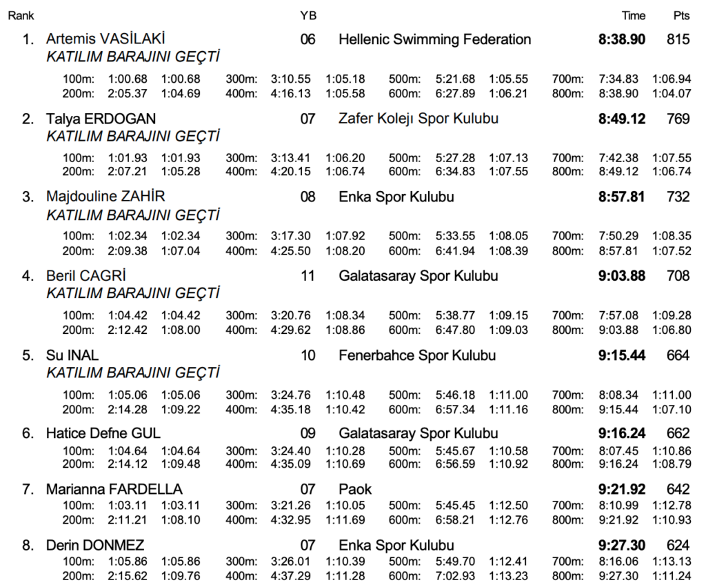 Με το 8:38.90 όμως που της χάρισε το χρυσό μετάλλιο στο μίτινγκ της τουρκικής πόλης, η Άρτεμις Βασιλάκη έπιασε με μεγάλη άνεση το όριο του 8:43.03 για το κορυφαίο ραντεβού της ηλικιακής της κατηγορίας που θα γίνει στα τέλη Ιουνίου στο Σαμορίν της Σλοβακίας. Η αθλήτρια της ομάδας της AVIN θα κυνηγήσει τη διάκριση στην πρώτη της χρονιά στην κατηγορία, ενώ απομένει να δούμε σε πόσα ακόμα αγωνίματα θα πιάσει όριο. Οι περσινές της επιδόσεις στα 400μ και τα 1500μ ελεύθερο αλλά και στα 400μ μεικτή ήταν καλύτερες από τα όρια για το Σαμορίν. Στην 7η θέση του αγώνα τερμάτισε η δεύτερη Ελληνίδα της κούρσας, Μαριάννα Φαρδέλλα (ΠΑΟΚ) με 9:21.92.
