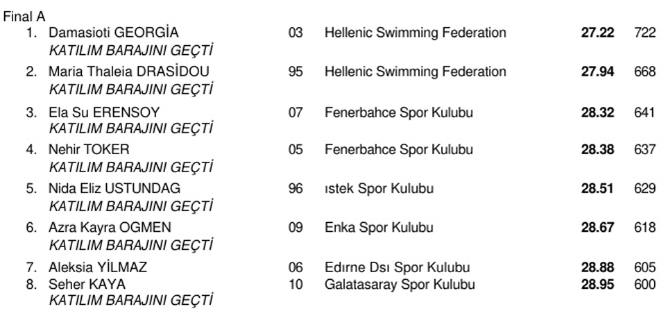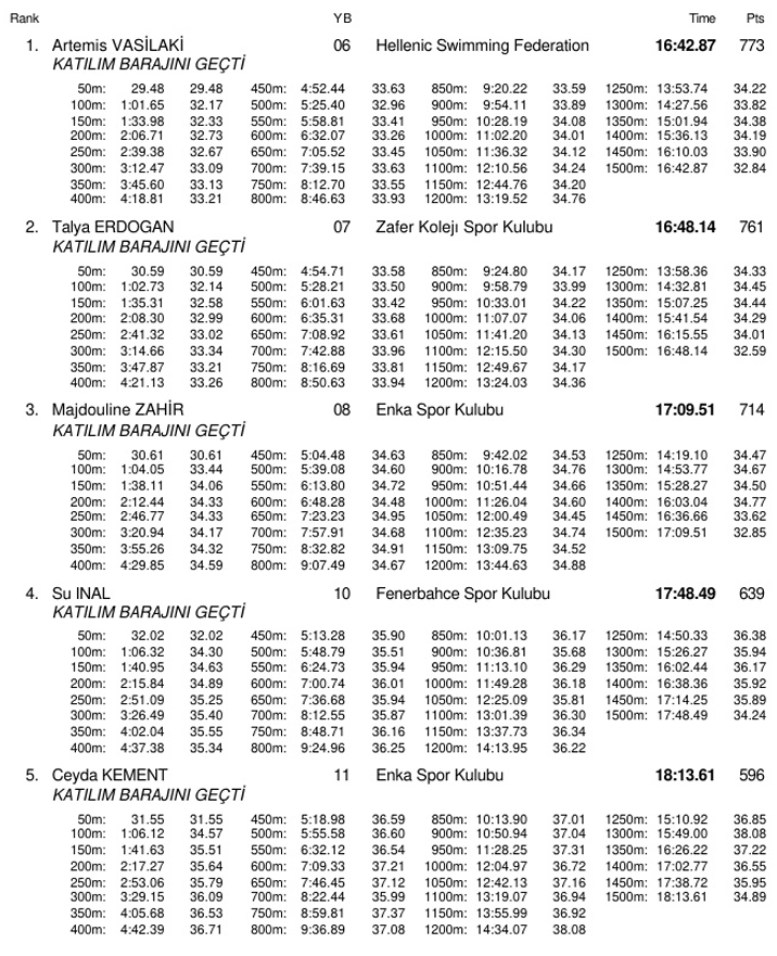 Πολύ καλές εμφανίσεις έκανε στη διοργάνωση και η Άρτεμις Βασιλάκη (Τρίτωνας Ηρακλείου) η οποία μετά τα δύο όρια για το Ευρωπαϊκό Κ23 σε 400-800μ ελεύθερο τις προηγούμενες μέρες, έφτασε πολύ κοντά και στο όριο των 1500μ. Η αθλήτρια της ομάδας της AVIN νίκησε την κούρσα με 16:42.87, 0.09 από το όριο του 16:42.78, κατέκτησε όμως το τρίτο της χρυσό στη διοργάνωση. Η Γεωργία Δαμασιώτη (Ωκεανός) έκανε τρία τα χρυσά της στη διοργάνωση αφού επικράτησε και στα 50μ πεταλούδα με 27.22, λίγο πιο αργά από το φετινό της 27.06.