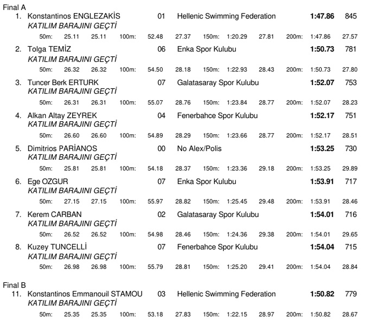 Πολύ καλές εμφανίσεις που δείχνουν τη δυναμική τους εν όψει του Παγκοσμίου του καλοκαιριού έκαναν ο Στέργιος Μπίλας (ΟΣΦΠ) και ο Κωνσταντίνος Εγγλεζάκης (ΑΝΟΓ). Ο πρώτος πήρε άλλο ένα χρυσό στα 50μ πεταλούδα με 23.52, το αγώνισμα στο οποίο είναι ο πρωταθλητής Ευρώπης με 23.06, και έδειξε σε καλή κατάσταση ανάμεσα στους προπονητικούς κύκλους. Το ίδιο ισχύει και για τον Εγγλεζάκη που μετά την καλύτερη εμφάνιση της τελευταίας τετραετίας στο 400άρι, επικράτησε στα 200μ ελεύθερο με 1:47.86, τον τέταρτο καλύτερο χρόνο της καριέρας του. Την 5η θέση στον τελικό κατέκτησε στην ίδια κούρσα ο Δημήτρης Παριανός (ΝΟΑ) με 1:53.25, ενώ στον Β τελικό επικράτησε με το αξιοπρεπέστατο -για την περίοδο- 1:50.82 ο Κωνσταντίνος Στάμου (ΑΟΠΦ).