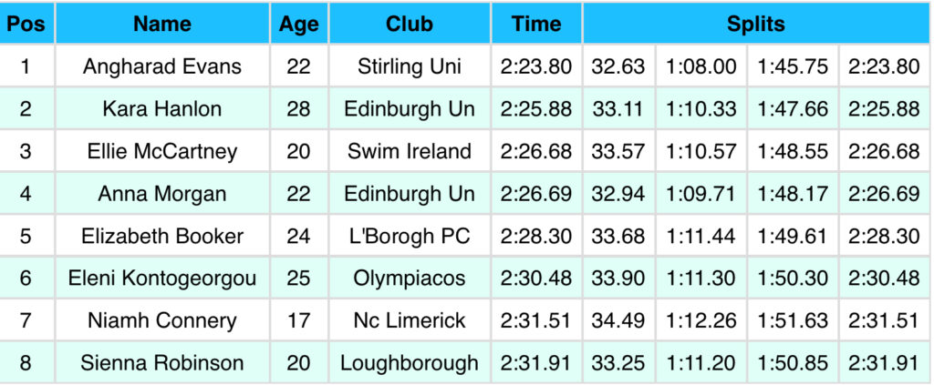 Η Ελένη Κοντογεώργου (ΟΣΦΠ) στο βασικό της αγώνισμα, τα 200μ πρόσθιο, εξασφάλισε την παρουσία της στον μεγάλο τελικό με ένα 2:31.60, ενώ στον απογευματινό τελικό κατέκτησε την έκτη θέση με 2:30.48 και σημείωσε την μέχρι στιγμής καλύτερη επίδοση στην Ελλάδα το 2025, η ίδια όμως στις αρχές του Δεκέμβρη είχε κολυμπήσει την απόσταση στον Τρόπαιο ΠΑΟ/ΤΥR σε 2:29.83.
