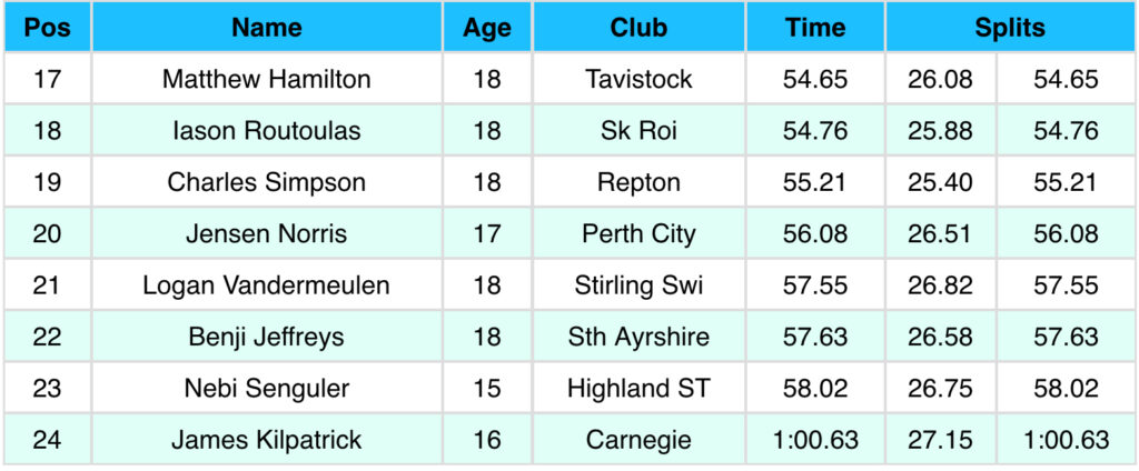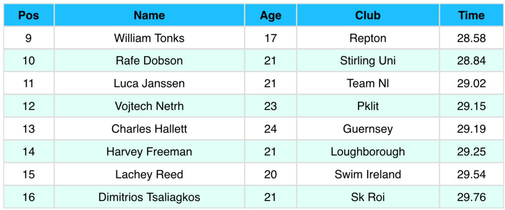 Στον Β τελικό των 50μ πρόσθιο ο Δημήτρης Τσαλιαγκός (ΣΚ Ροή) τερμάτισε 8ος (16ος στο σύνολο) με 29.76, ενώ στον πρωινό προκριματικό ήταν πιο γρήγορος με 29.27. Ο Ιάσονας Ρούτουλας (ΣΚ Ροή) αγωνίστηκε στον Γ τελικό των 100μ πεταλούδα (αποκλειστικά γιια εφήβους) και τερμάτισε 2ος με ατομικό ρεκόρ 54.76. Ακολουθούν τα αποτελέσματα των τελικών σειρών με τις τρεις ελληνικές παρουσίες: