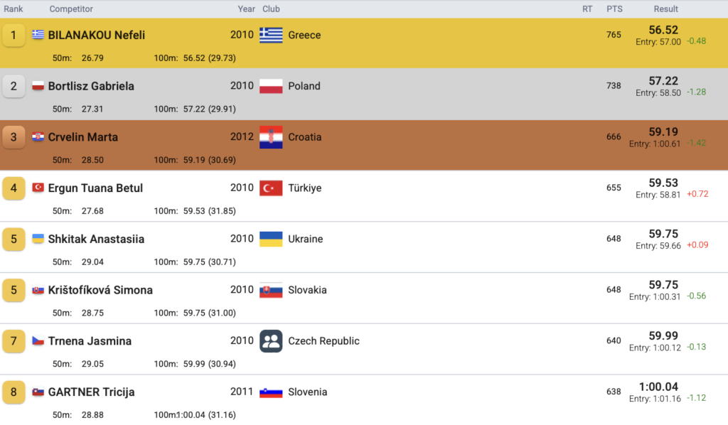 Η Μπιλανάκου ακούμπησε τον τοίχο αρκετά γρηγορότερα από τις συναθλήτριές της και βελτίωσε το ατομικό της ρεκόρ (57.00), ξεπερνώντας για πρώτη φορά το φράγμα των 57 δευτερολέπτων. Με χρόνο 56.52, η 15χρονη αθλήτρια που διανύει την πρώτη της χρονιά στην κατηγορία των κορασίδων έφτασε 10 εκατοστά του δευτερολέπτου μακριά από το πανελλήνιο ρεκόρ της κατηγορίας, που ανήκει στη Νόρα Δράκου από το μακρινό 2008. Στο αντίστοιχο αγώνισμα των παίδων ο Μιχαήλ Σαββίδης σταμάτησε το χρονόμετρο στα 53.26 και ήρθε δεύτερος πίσω από τον Τούρκο Μπατού Ιμπολάρ που τερμάτησε αρκετά πιο γρήγορα σε 52.62.