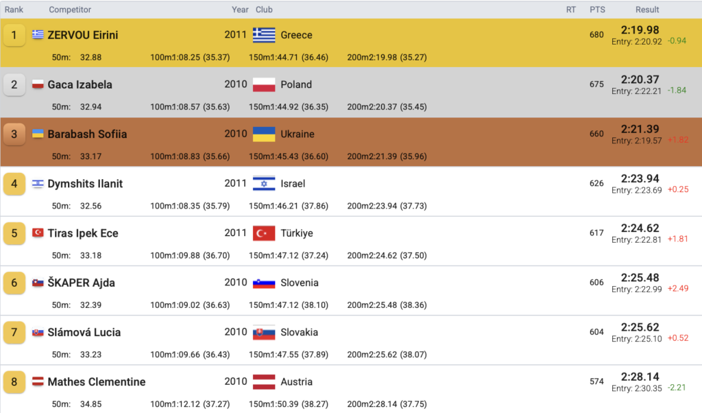 Γρηγορότερη από όλες ήταν και η Ειρήνη Ζερβού στα 200μ ύπτιο, η οποία κατέβηκε για πρώτη φορά στην καριέρα της το 2:20 και βελτίωσε το ατομικό της ρεκόρ τερματίζοντας σε 2:19.98. Το βάθρο συμπληρώθηκε από την Πολωνή Ιζαμπέλα Γκάκα και την Ουκρανή Σοφία Μπαραμπάς που μονομάχησαν για το χρώμα του μεταλλίου και ολοκλήρωσαν την κούρσα τους πολύ κοντά με 2:20.37 και 2:20.39.