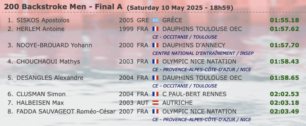 Mετά την χθεσινή του νίκη στα 200μ πεταλούδα, o 20χρονος κολυμβητής επικράτησε και στην κούρσα των 200μ ύπτιο, τερματίζοντας σε 1:55.18, χρόνο καλύτερο από το δικό του πανελλήνιο ρεκόρ Κ23 του 1:55.42 που πέρσι τον Ιούνιο του είχε χαρίσει το αργυρό μετάλλιο στο Ευρωπαϊκό Πρωτάθλημα του Βελιγραδίου. Η παραπάνω επίδοση βρίσκεται 36 εκατοστά του δευτερολέπτου μακριά από το πανελλήνιο ρεκόρ ανδρών που ανήκει στον αργυρό Ολυμπιονίκη του Παρισιού Απόστολο Χρήστου και αντιστοιχεί σε χρόνο που θα έδινε την 4η θέση στους Ολυμπιακούς Αγώνες του 2024, ενώ παράλληλα είναι καλύτερος από το 1:55.55 του Όλιβερ Μόργκαν που μέχρι πρότινος αποτελούσε την κορυφαία επίδοση στον κόσμο για το 2025.