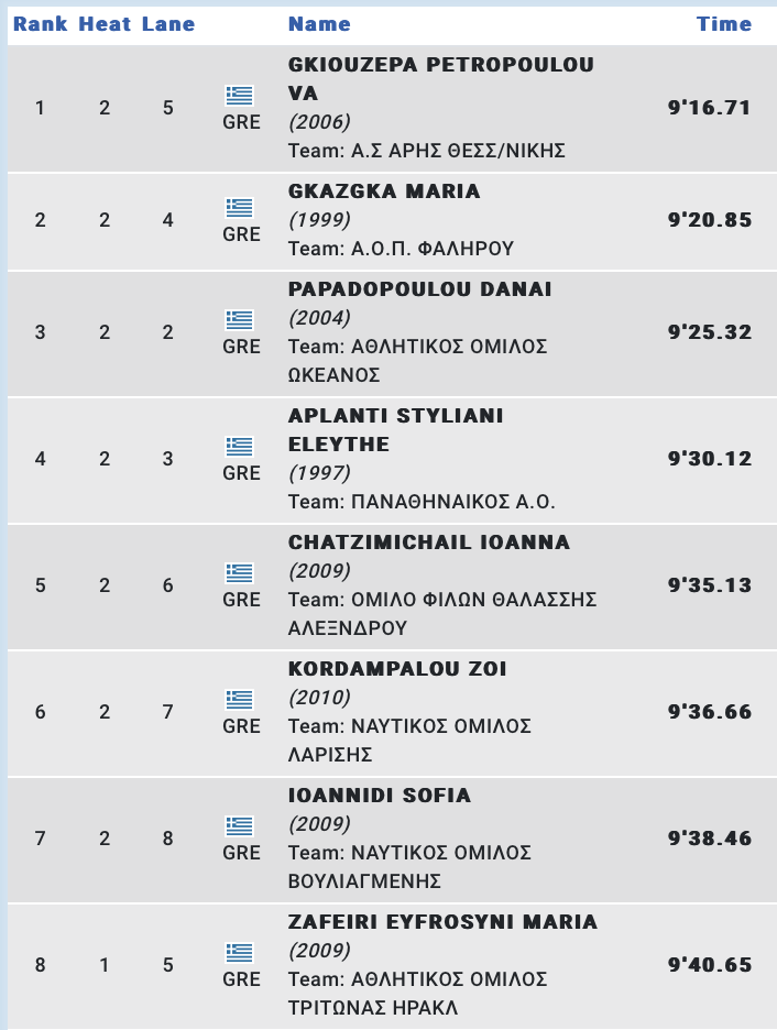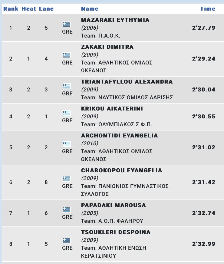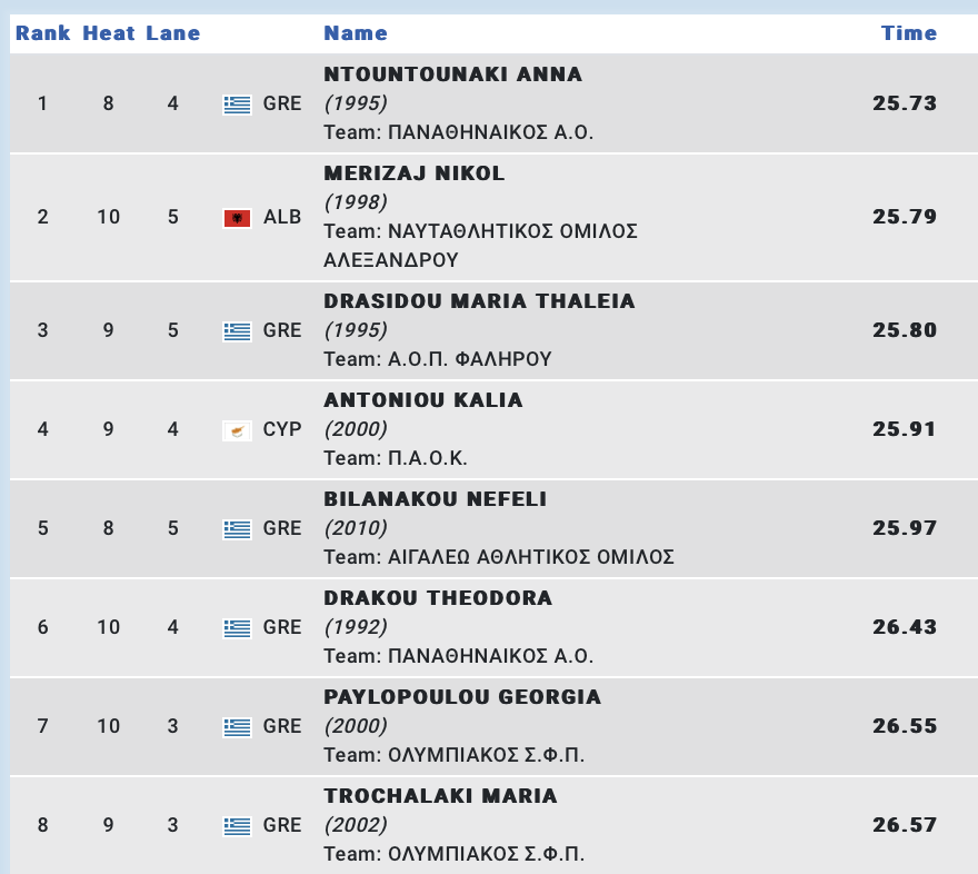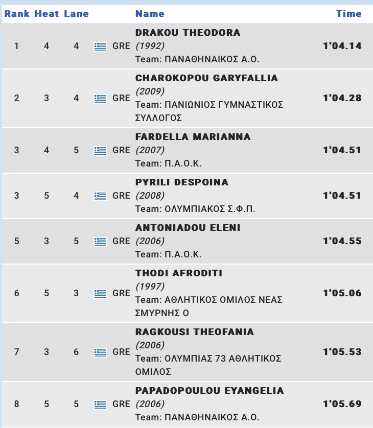 Η Νόρα Δράκου δεν πιέστηκε ιδιαίτερα το πρωί και πήρε την πρόκριση για τον τελικό των 100μ ύπτιο με τον καλύτερο χρόνο, ακουμπώντας τον τοίχο σε 1:04.14. Πίσω της ακολούθησαν οι νεάνιδες Γαρυφαλλιά Χαροκόπου, Μαριάννα Φαρδέλλα και Δέσποινα Πυριλή με χρόνους 1:04.28, 1:04.51 και 1:04.51, οι οποίες το απόγευμα θα παλέψουν για μια θέση στο βάθρο. Λίγο αργότερα, η Δράκου κολύμπησε και στον προκριματικό των 50μ ελεύθερο και εξασφάλισε διπλή παρουσία στα απογευματινά τελικά, εκεί όπου θα βρεθεί δίπλα στις επίσης κορυφαίες Άννα Ντουντουνάκη, Κάλια Αντωνίου, Μαρίλεια Δρασίδου, καθώς και τη 15χρονη Νεφέλη Μπιλανάκου και την Αλβανίδα Νικόλ Μεριζάχ.