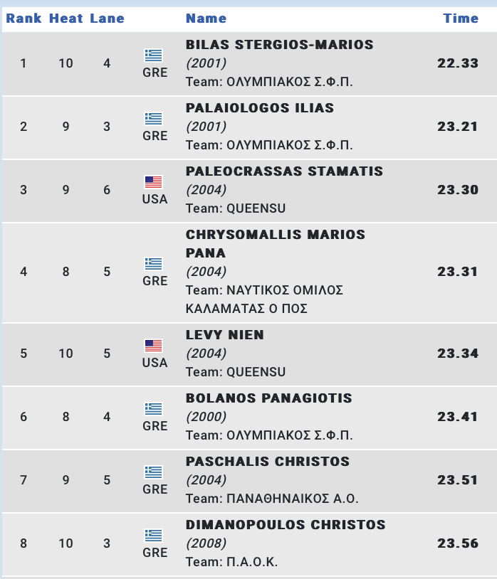 Ο Στέργιος Μπίλας έδειξε από το πρωί το πόσο γρήγορα μπορεί να κολυμπήσει, τερματίζοντας τον προκριματικό των 50μ ελεύθερο σε 22.33, και το απόγευμα θα επιδιώξει να σταματήσει το χρονόμετρο σε χρόνο κάτω από τα 22. Ο Απόστολος Χρήστου, ο Απόστολος Σίσκος και ο Βαγγέλης Μακρυγιάννης έκαναν ένα πρώτο ξεμούδιασμα στον πρωινό προκριματικό των 100μ ύπτιο και το απόγευμα θα αναμετρηθούν για τη νίκη σε μια από τις πιο ενδιαφέρουσες κούρσες της διοργάνωσης. Ο Σίσκος ήταν ο γρηγορότερος από όλους το πρωί με 55.06, επιβεβαιώνοντας ξανά την εξαιρετική του φόρμα, ενώ ο Χρήστου και ο Μακρυγιάννης σημείωσαν 56.58 και 56.15 αντίστοιχα με στόχο να κρατήσουν όσο το δυνατόν περισσότερες δυνάμεις για τον τελικό. Πολύ καλοί ήταν επίσης ο Θοδωρής Ανδρεόπουλος με τον Φίλιππο Ανδριαδάκη, οι οποίοι θα προσπαθήσουν να ακολουθήσουν τον ρυθμό των τριών παραπάνω με τον τελευταίο να κυνηγά παράλληλα το 55.02 που είναι το όριο για το Ευρωπαϊκό Κ23 του Σαμορίν.