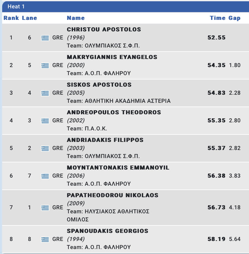 Ο αργυρός ολυμπιονίκης του Παρισιού στα 200μ του συγκεκριμένου στιλ είχε υψηλό ανταγωνισμό από τους Βαγγέλη Μακρυγιάννη και τον Απόστολο Σίσκο στον τελικό των 100μ, αλλά δεν άφησε περιθώρια για ανατροπή και κυριάρχησε στο αγαπημένο του αγώνισμα με χρόνο 52.55. Η παραπάνω επίδοση είναι λίγο χειρότερη από το 52.51 που είχε σημειώσει στο Ακρόπολις (φετινό ρεκόρ) και η 7η καλύτερη στον κόσμο στο αγώνισμα αυτή τη στιγμή. Στην δεύτερη θέση του αγώνα ακολούθησε ο Βαγγέλης Μακρυγιάννης με 54.35, ενώ το βάθρο συμπλήρωσε ο Απόστολος Σίσκος με 54.83.