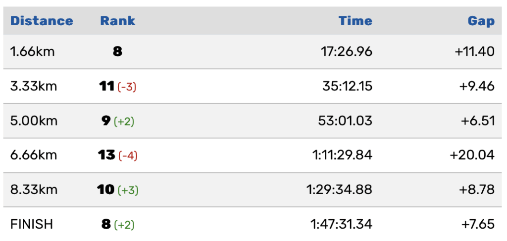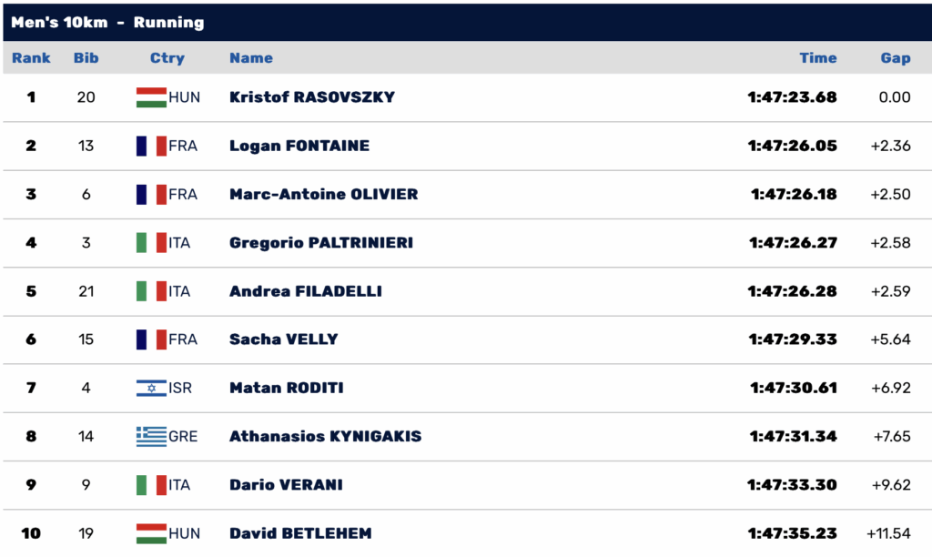 H πρωτιά πήγε στον Ούγγρο χρυσό Ολυμπιονίκη του Παρισιού, Κρίστοφ Ραζόφσκι με 1:47:23, ενώ το βάθρο συμπλήρωσαν ο Γάλλος εν ενεργεία παγκόσμιος πρωταθλητής στα 5χλμ, Λόγκαν Φοντάν, και ο συμπατριώτης του Μαρκ-Αντουάν Ολιβιέ, δευτεραθλητής κόσμου στο Παγκόσμιο της Ντόχα που μονομάχησαν για τη δεύτερη θέση και τερμάτισαν σε 1:47:26.05 και 1:47:26.18.