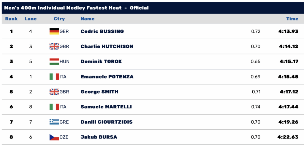 Ο τέταρτος στο Ευρωπαϊκό ανδρών του Βελιγραδίου δεν κατάφερε να βρει τον καλό του εαυτό και τερμάτισε σε 4:19.26, σχεδόν τρία δευτερόλεπτα μακριά από το ατομικό του ρεκόρ (4:16.64). Η νίκη πήγε στον Γερμανό Σέντρικ Μπούσινγκ, ενώ το βάθρο συμπλήρωσαν οι Τσάρλι Χάτσισον και Ντόμινικ Τόροκ με 4:14.12 και 4:15.17. Στη συνδυαστική κατάταξη από όλες τις σειρές, ο αθλητής του Άκη Οικονόμου κατέκτησε την όγδοη θέση. Ο Γιουρτζίδης θα συνεχίσει αύριο με τα 200μ μεικτή, ελπίζοντας σε ένα καλύτερο αποτέλεσμα.