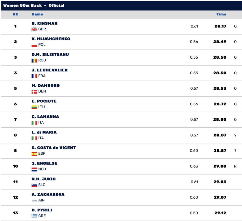 Η Δέσποινα Πυρίλη μπορεί να μην κολύμπησε όσο γρήγορα χρειαζόταν για να κατοχυρώσει μια θέση στην κορυφαία οκτάδα της Ευρώπης στα 50μ ύπτιο, αλλά κατέκτησε την διόλου κακή 13η θέση στο πρώτο της αγώνισμα στη φετινή διοργάνωση.
