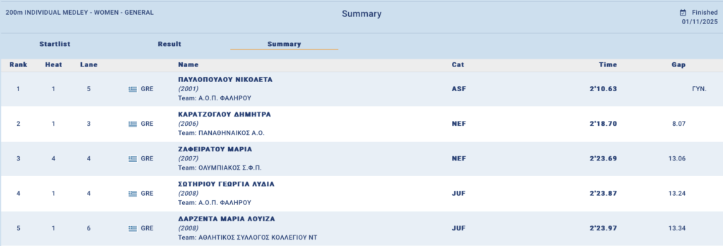 Η Παυλοπούλου σταμάτησε το χρονόμετρο σε 2:10.63, σχεδόν 4 δευτερόλεπτα πιο γρήγορα από το 2:14.38 της Χαλκίδη, ενώ πλησίασε αρκετά το όριο της ΚΟΕ για το Ευρωπαϊκό Πρωτάθλημα 25άρας του Λούμπλιν (2:10.16). Η αθλήτρια του Γιώργου Δαμασιώτη διέλυσε το ατομικό της ρεκόρ, το οποίο ήταν 2:15.06 από το 2024.