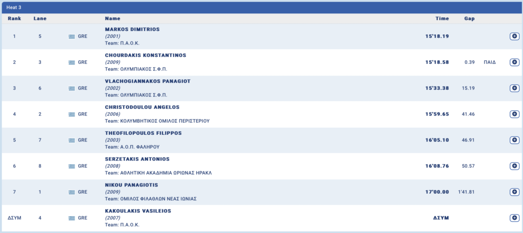 Παρότι ο Χουρδάκης (ΟΣΦΠ) προηγήθηκε στο μεγαλύτερο μέρος της κούρσας, ο Μάρκος (ΠΑΟΚ) κρατήθηκε σε απόσταση αναπνοής, έκανε την επίθεσή του στο τελευταίο 50άρι και κατάφερε να κατακτήσει την κορυφή στο βάθρο των νικητών με 15:18.19 έναντι του 15:18.58 του Χουρδάκη παρά την κούραση από τον τελικό των 200μ ελεύθερο λίγη ώρα νωρίτερα.