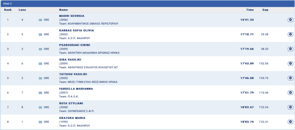Στις γυναίκες η Γεωργία Μακρή (ΚΟ Περιστερίου) κολύμπησε χωρίς ανταγωνισμό στα μέτρα της, αφού δεν έπεσε στο αγώνισμα η κάτοχος του πανελλήνιου ρεκόρ Άρτεμις Βασιλάκη (Τρίτωνας Ηρακλείου). Τερμάτισε όμως σε 16:41.33, πολύ κοντά στο 16:40.92 που έχει από φέτος ως ατομικό ρεκόρ. Τη δεύτερη θέση με 17:10.71 πήρε η Σοφία Ολίβια Καρράς (ΑΟΠΦ) και την τρίτη η 16χρονη Ειρήνη Ψαρουδάκη (Ωρίωνας Ηρακλείου) με 17:19.66.