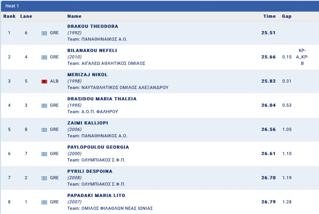 Η Νόρα Δράκου (ΠΑΟ) πήρε το χρυσό μετάλλιο, τερματίζοντας σε 25.51, αλλά η Νεφέλη Μπιλανάκου τράβηξε τα βλέμματα, καθώς κατάφερε να βελτιώσει το δικό της πανελλήνιο ρεκόρ κορασίδων με 25.66 (είχε 25.77.). Επόμενος στόχος για την κολυμβήτρια του ΑΟ Αιγάλεω θα είναι το όριο για το Ευρωπαϊκό Πρωτάθλημα Κ19 του Μονάχου (25.61) αλλά και το πανελλήνιο ρεκόρ νεανίδων της Ηλιάνας Οικονόμου (25.40). «Χάλκινη» ήταν η εκπρόσωπος της Αλβανίας Νικόλ Μεριζάι με 25.82.