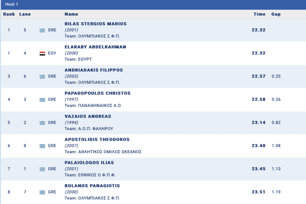 Ο Στέργιος Μπίλας (ΟΣΦΠ) και ο Αιγύπτιος Αμπντελραχμάν Ελαραμπί μοιράστηκαν το χρυσό μετάλλιο, αφού ακούμπησαν τον τοίχο ταυτόχρονα σε 22.32. Το όριο για το Ευρωπαϊκό Πρωτάθλημα του Παρισιού έχει οριστεί στα 23.00, αλλά ο Μπίλας έχει ήδη εξασφαλίσει τη συμμετοχή του στη διοργάνωση χάρη στο 23.00 που είχε πετύχει στο Παγκόσμιο της Σιγκαπούρης. Το βάθρο συμπληρώθηκε από τον Φίλιππο Ανδριαδάκη (ΟΣΦΠ) με 22.57, ενώ πιο κάτω στην πέμπτη θέση με 23.14 έμεινε ο Ανδρέας Βαζαίος (ΑΟΠΦ).