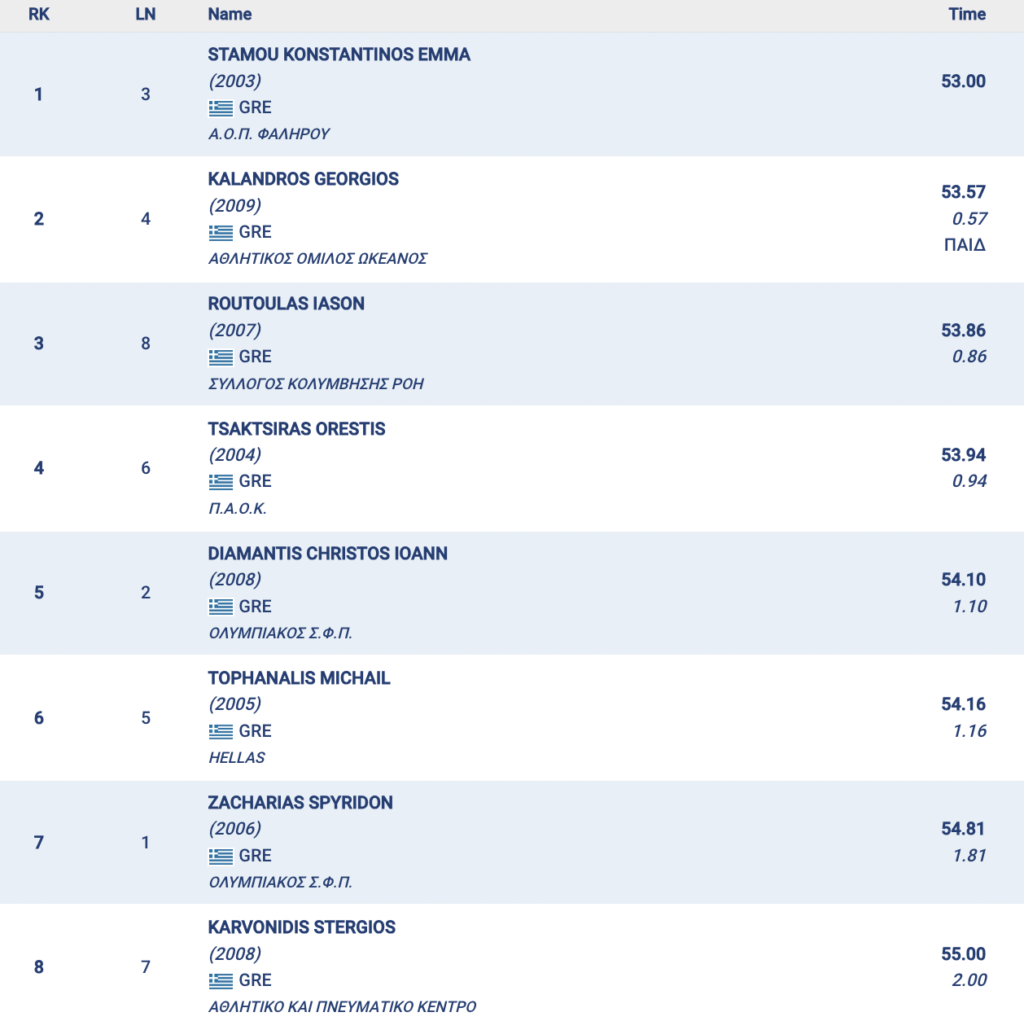Εξαιρετικός ήταν και ο Κώστας Στάμου στο αντίστοιχο αγώνισμα των ανδρών με έναν αρκετά γρήγορο χρόνο για την πρεμιέρα της σεζόν, όπως συνηθίζει τα τελευταία χρόνια. Ο αθλητής του ΑΟΠΦ σημείωσε 53.00, μένοντας 0.45 μακριά από το ατομικό του ρεκόρ και επικράτησε του Γιώργου Κάλανδρου, ο οποίος κατέγραψε τη γρηγορότερη κούρσα της καριέρας του και κατέρριψε για δεύτερη φορά μέσα στη μέρα το δικό του πανελλήνιο ρεκόρ παίδων (54.09) στο αγώνισμα με 53.57. Το χάλκινο πήγε στον Ιάσονα Ρούτουλα με 53.86.
